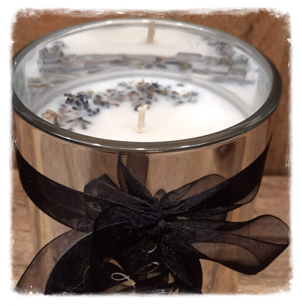 Deze kaars is verrijkt met 100% natuurlijke etherische lavendel olie en lavendel geurolie.