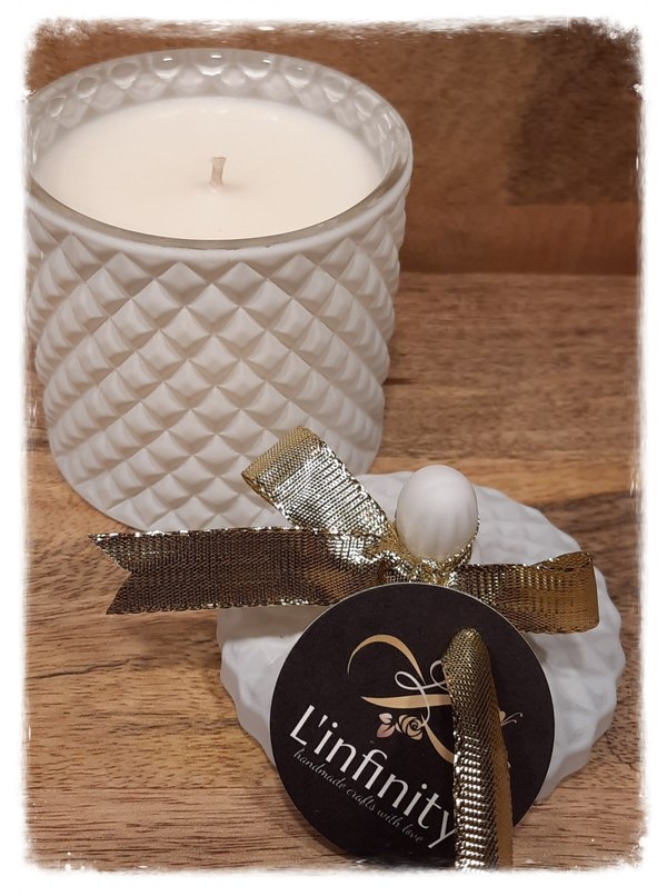 Een 100 % handgemaakte natuurlijke kaars vervaardigd uit een mix van kokos-en sojawas.